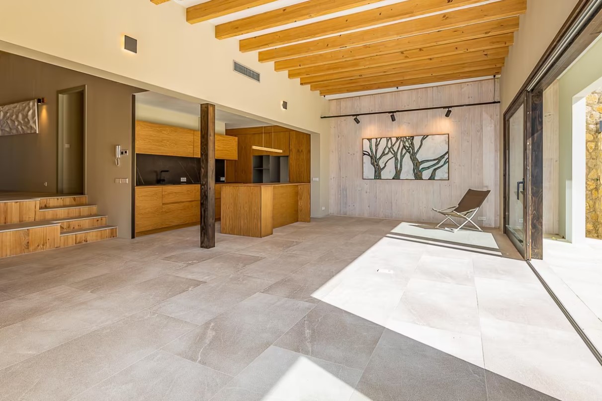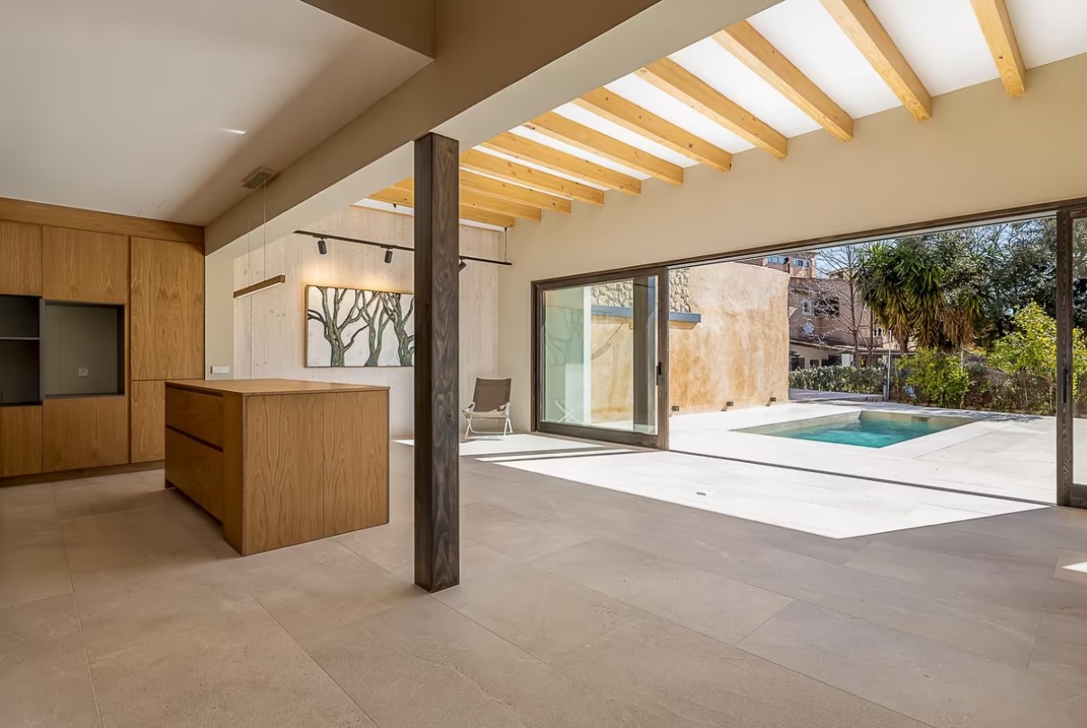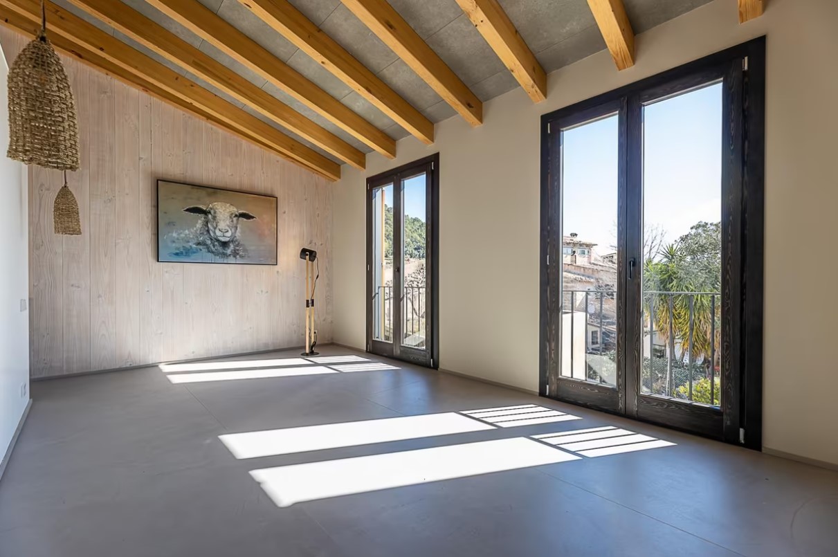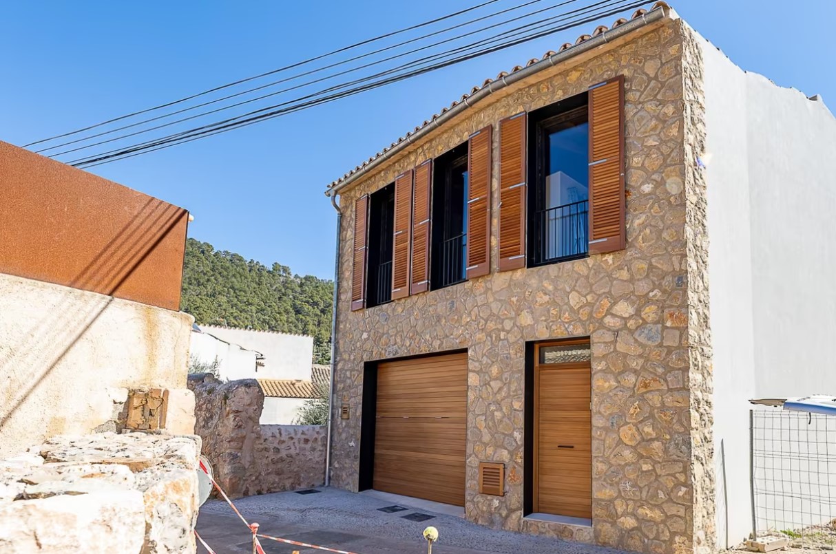 Proyecto realizado en una gran vivienda situada en Alaró, un pueblo al norte de la isla en plena serra de Tramuntana, el estilo que rebosa esta vivienda es de luz y transparencia, sus grandes ventanales al exterior deja fluir toda la luz hacia espacios diáfanos, en este caso cuenta con sistemas de corredera de grandes dimensiones en la planta baja y cerramientos de perfilería europea lacada en color en el resto de plantas, puerta de entrada y persianas realizadas en madera de Iroko natural, la decoración en las varias dependencias se ha realizado en pino tricapa con teñidos jugando con los materiales texturas de las paredes y resto de mobiliario.
