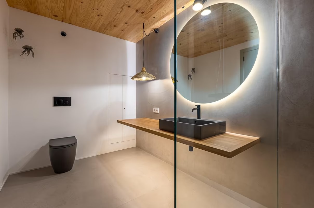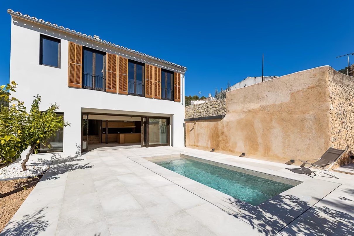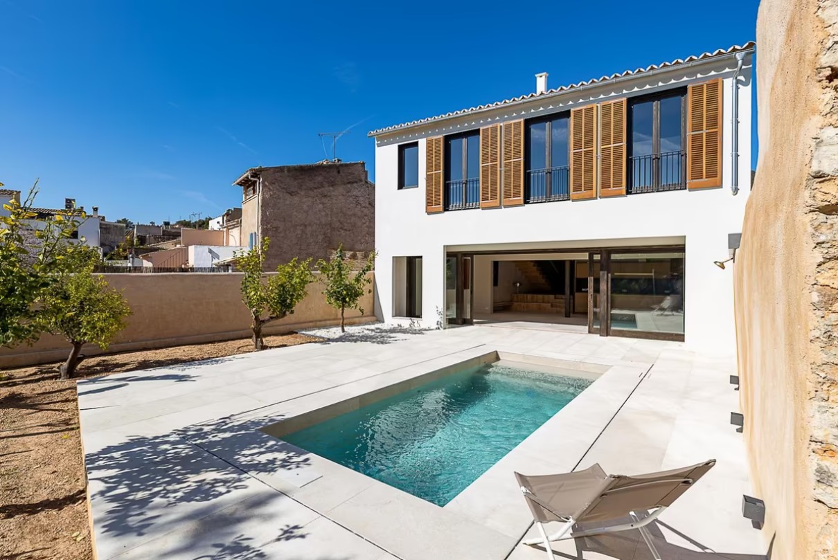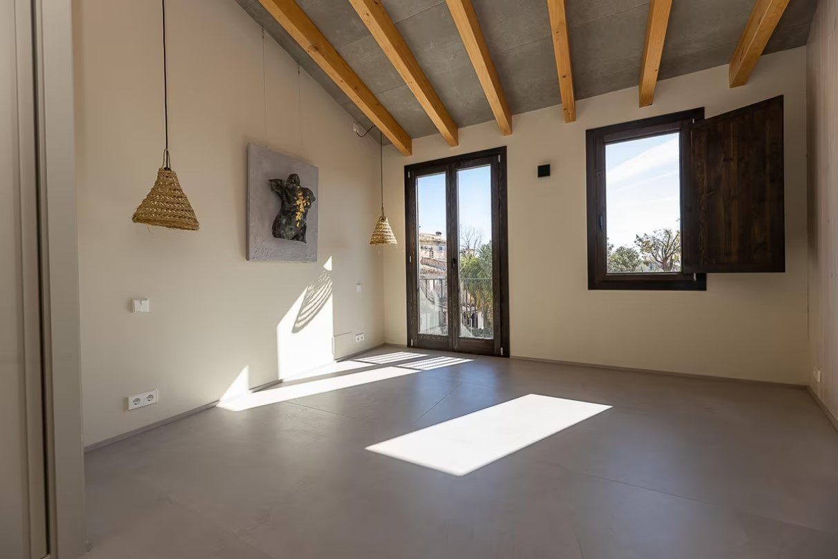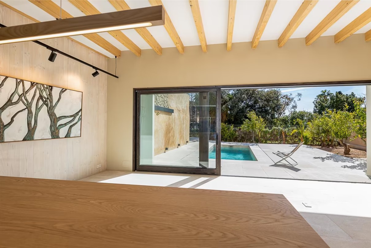 Proyecto realizado en una gran vivienda situada en Alaró, un pueblo al norte de la isla en plena serra de Tramuntana, el estilo que rebosa esta vivienda es de luz y transparencia, sus grandes ventanales al exterior deja fluir toda la luz hacia espacios diáfanos, en este caso cuenta con sistemas de corredera de grandes dimensiones en la planta baja y cerramientos de perfilería europea lacada en color en el resto de plantas, puerta de entrada y persianas realizadas en madera de Iroko natural, la decoración en las varias dependencias se ha realizado en pino tricapa con teñidos jugando con los materiales texturas de las paredes y resto de mobiliario.
