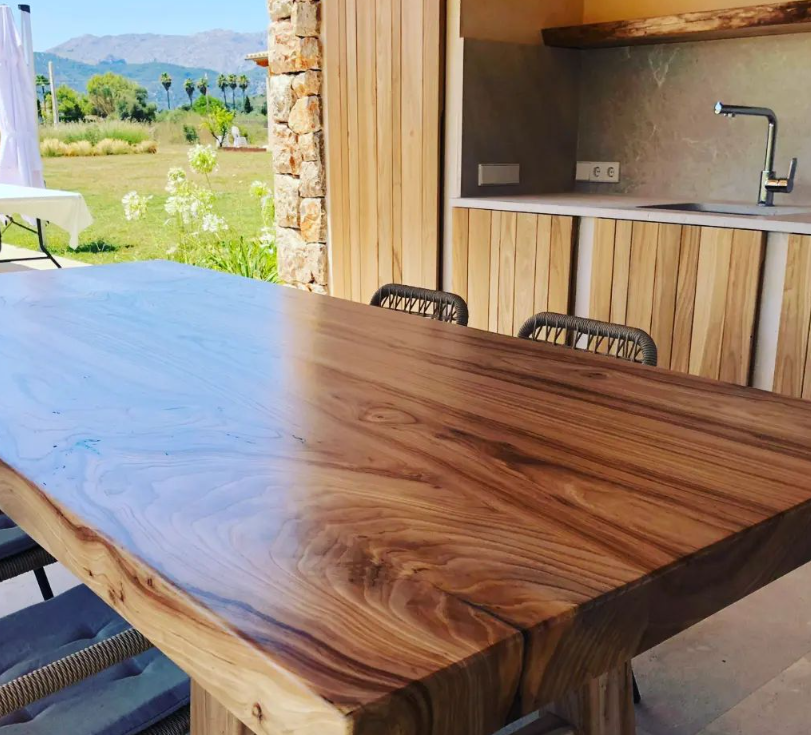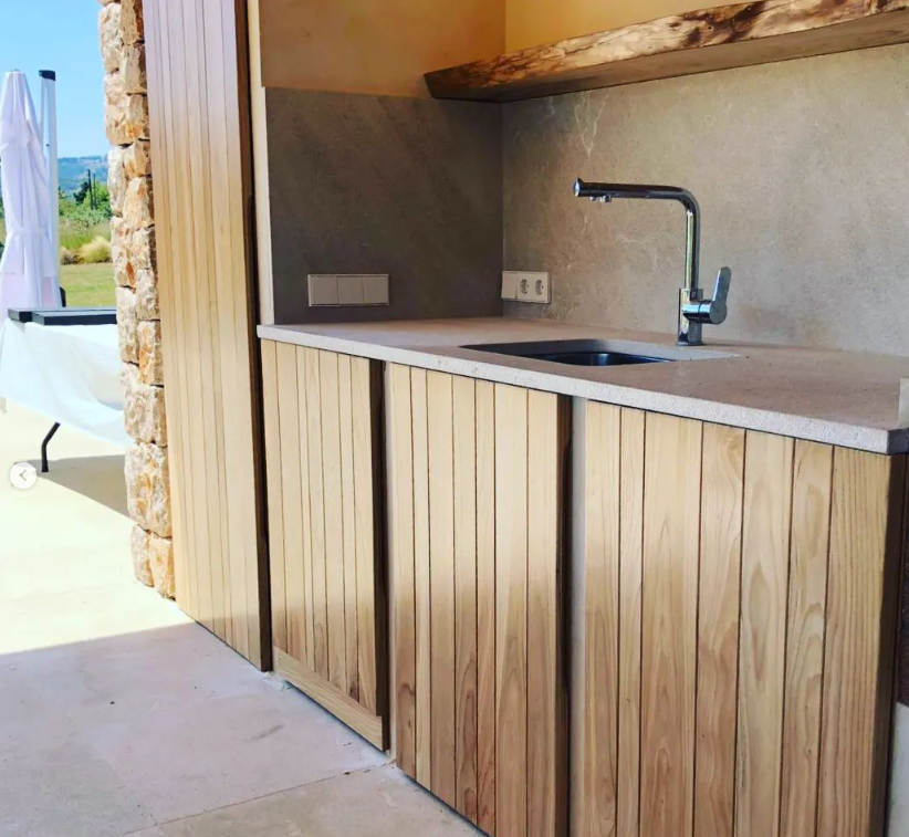 En aquesta vivenda es va realizar tota la fusteria interior i exterior. Però, cal destacar la zona de la piscina on s'hi va projectar una fantàstica cuina exterior i una taula totalment fet a mida. Es va mantenir una línea rústica que acompanyava a la perfecció l'entorn i es va obtenir un resultat molt confortable i equipat. Tot el mobiliari de la cuina també es va fabricar a mida. Les portes de la cuina duen un sistema de tiradors ocults / integrats a fi de donar-li un aire més actual ja que l'estètica general era de caire rústic i així s'aconseguí un resultat més minimalista.